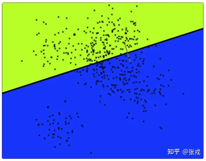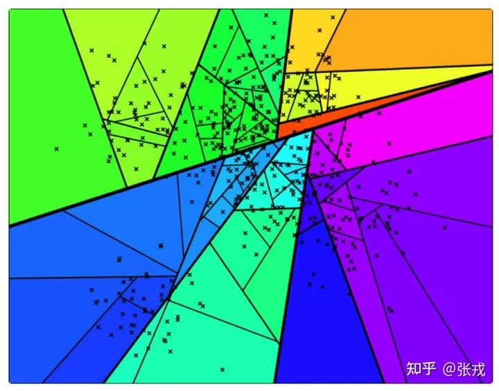 刚开始的时候,在数据集中随机选择两个点,然后用它们的中垂线来切分整个数据集,于是数据集就被分成了蓝绿两个部分。然后再随机两个平面中各选出一个顶点,再用中垂线进行切分,于是,整个平面就被切成了四份。
