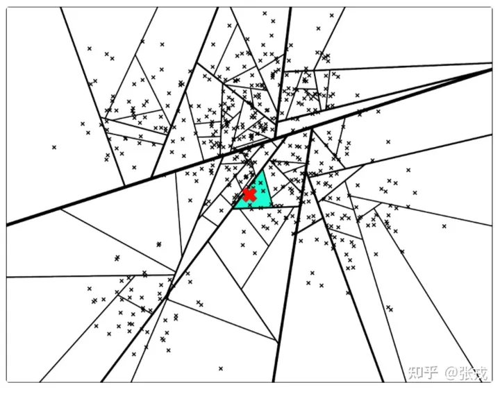 下面,新来的一个点(用红色的叉表示),通过对二叉树的查找,我们可以找到所在的子平面,然后里面最多有 K = 10 个点。从二叉树的叶子节点来看,该区域只有 7 个点。